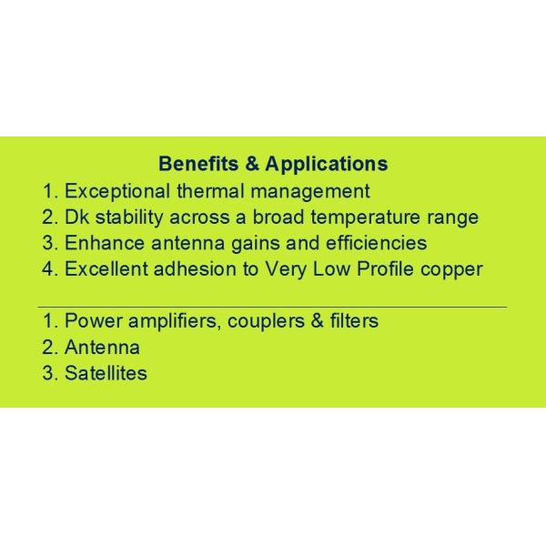 This material offers superior heat dissipation performance, so it's a type of thermally conductive low loss laminate. It's best suited for high power applications. Heat dissipates away from both transmission line on PCB and surface mount components such as capacitor etc.
